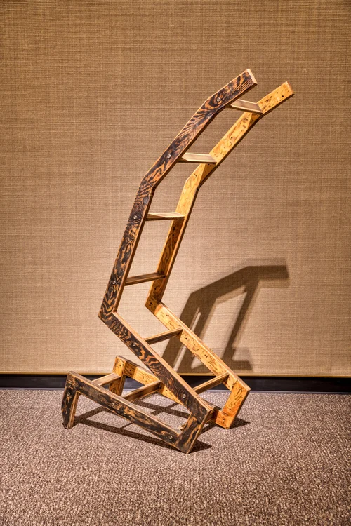 In a kneeling posture a 10’ ladder has lowered itself. An object often associated with up has humbly come down. Thoughts ascend heaven-ward when on knees in supplication. The ladders exterior is scarred, battered and beaten; however, its inside is cleaner and the damaged is fading.