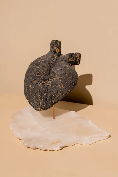 Coal is passive and dirty but in the form of a heart, light and dark metaphors emerge. Each are a buried source of power that generates heat and energy. Each are common until altered. Yet to be determined is the final product: ash or gem.