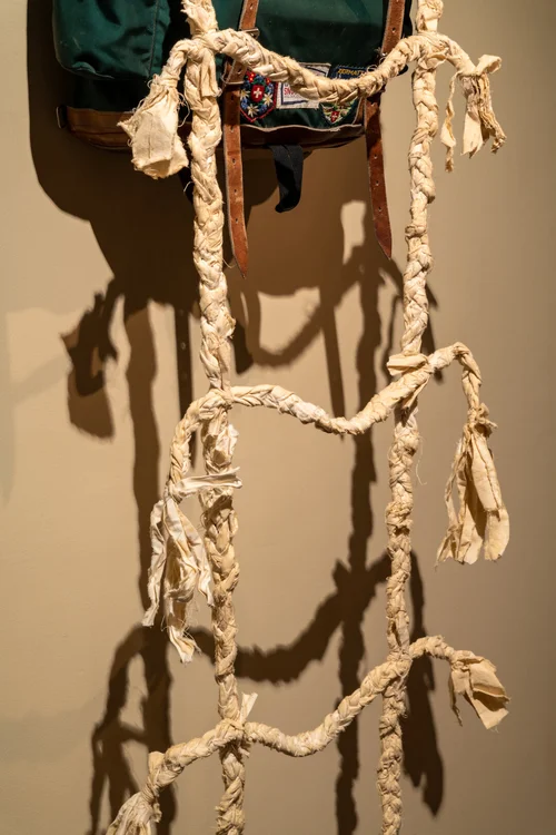 A braided rope ladder, simulating pigtails, rolls off the shoulders of someone who’s been a little further up the mountain. It seems a rather intimate and trusting thing for a woman to to braid another woman’s hair. This moment provides the perfect opportunity for grandmothers, mothers, sisters and friends to give encouragement, guidance and support.